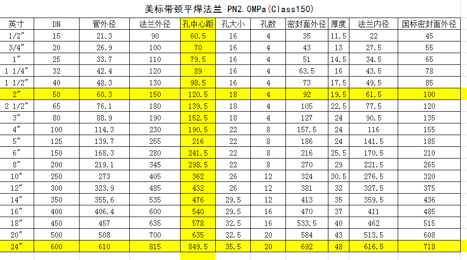 美標法蘭通常是指作為美國 國 家標準的ASME B16.5、B16.36、b16.47、B16.48所描述的法蘭標準。美標法蘭的壓力等級適用再PN2.5~PN4.0。材質可為碳鋼、304、316、316L等。美標法蘭尺寸標準和我們國標或者行標法蘭不同。那么,美標帶頸平焊法蘭的尺寸是怎樣的呢?下面我們來了解一下: